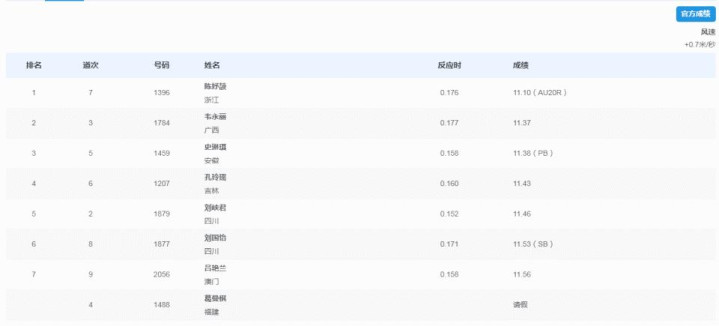 在昨天的女子100米预赛中,福建名将葛曼棋11秒36获得预赛总成绩第一,16岁的陈妤颉以11秒39获得预赛第二,另外名将韦永丽、刘峡君、袁琦琦等名将也顺利晋级复赛。